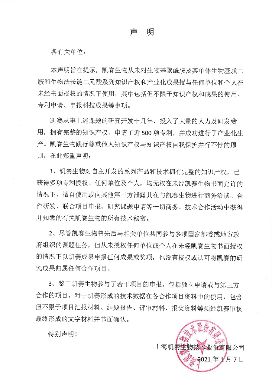 《關(guān)于凱賽生物知識(shí)產(chǎn)權(quán)和產(chǎn)業(yè)化成果的聲明》